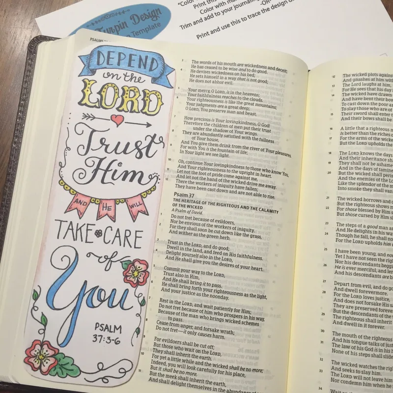 Bible Journaling Verse Art - Margin Art - Bookmark featuring Psalm 37:3-6 -- Depend on the Lord, He will Take care of You