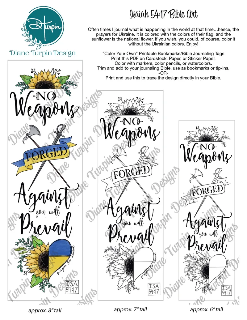 Prayers for Ukraine Bible Journaling Verse Art - Margin Art - Bookmark featuring Isaiah 54:17